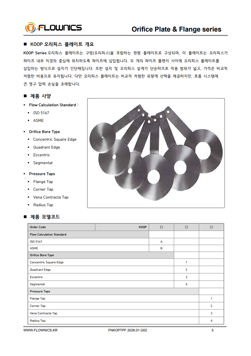 KOOP Series오리피스 플레이트는 구멍(오리피스)을 포함하는 원형 플레이트로 구성되며, 이 플레이트는 오리피스가 파이프 내부 직경의 중심에 위치하도록 파이프에 삽입됩니다. 두 개의 파이프 플랜지 사이에 오리피스 플레이트를 삽입하는 방식으로 설치가 간단해집니다. 또한 설치 및 오리피스 설계가 단순하므로 적용 범위가 넓고, 가격은 비교적 저렴한 비용으로 유지됩니다. 다만 오리피스 플레이트는 비교적 저렴한 유량계 선택을 제공하지만, 흐름 시스템에 큰 영구 압력 손실을 초래합니다.
