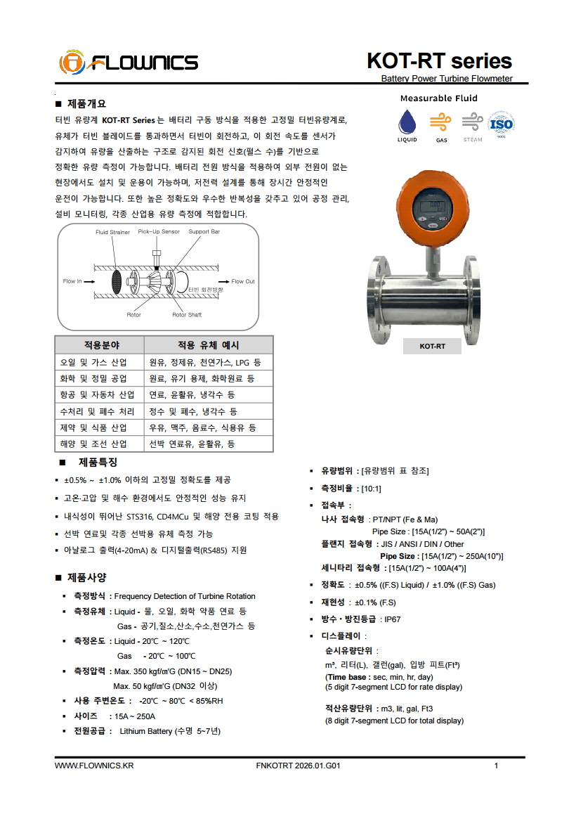 KOT-RTSH 터빈 유량계는 배터리 전원으로 구동되는 고정밀 유량 측정 장비로, 전원 배선이 어려운 현장에서도 액체/기체 유량을 안정적으로 측정하도록 설계되었습니다. 산업용 터빈 유량계의 검증된 구조를 기반으로 내구성과 신뢰성을 강화했으며, 설비 진단·공정 관리·설비 시운전 등 다양한 현장에서 활용할 수 있습니다. 유체 흐름에 따라 터빈 블레이드가 회전하고, 그 회전 속도와 유량이 정비례하는 원리를 이용해 유량을 산출하며, ±0.5%~1.0% 수준의 정밀도와 우수한 반복성을 제공합니다.