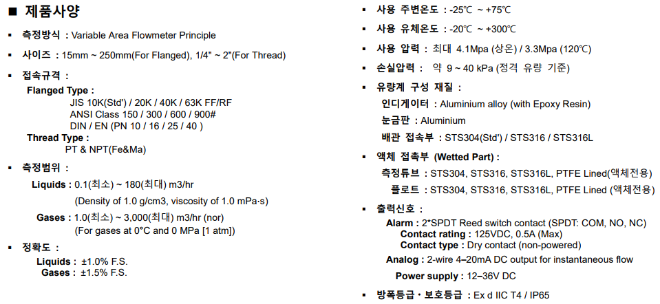 ✔ ±1.5% F.S. 수준의 정확도와 10:1 유량 범위