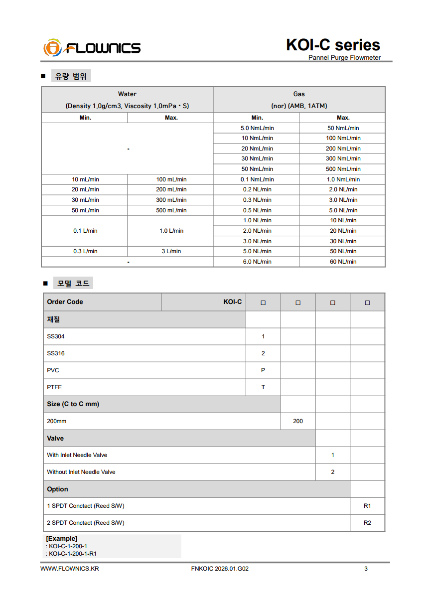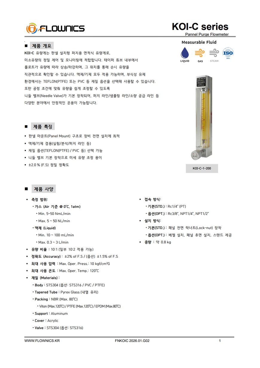 KOI-C Series는 판넬 설치형 퍼지용 면적식유량계로, 미소유량을 정밀하게 제어·모니터링해야 하는 라인에 최적화된 제품입니다. 테이퍼 튜브 내부에서 플로트가 유량에 따라 상승/하강하며, 전면 스케일을 통해 순시 유량을 직관적으로 확인할 수 있습니다. 액체/기체 모두 적용 가능하고, 부식성 유체 환경에서는 TEFLON(PTFE) 또는 PVC 등 재질 옵션을 선택해 운용할 수 있습니다. 또한 니들밸브로 공정 조건에 맞춰 유량을 미세하게 조정할 수 있어 퍼지 라인, 샘플링 라인, 소량 공급 라인 등 다양한 분야에서 안정적으로 사용됩니다.