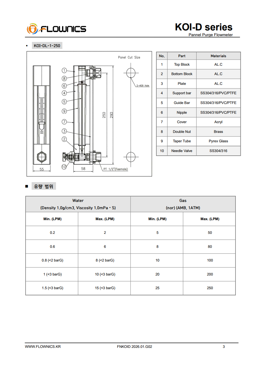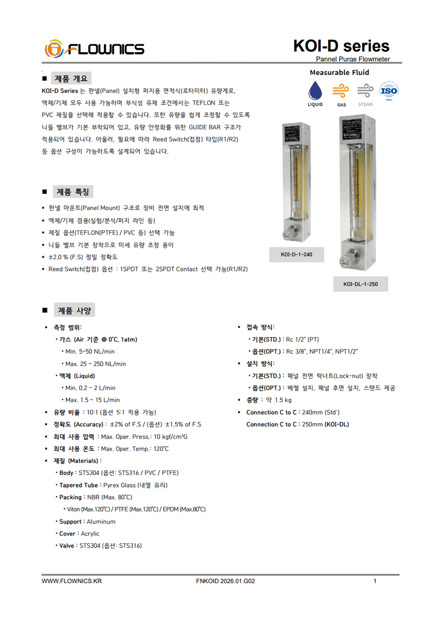 KOI-D Series는 판넬 설치형 퍼지용 면적식 유량계로, 현장에서 미세 유량을 안정적으로 표시·조정해야 하는 라인에 적합합니다. 테이퍼 튜브 내부의 플로트 가 유량에 따라 상승·하강하며, 스케일을 통해 순시 유량을 직관적으로 확인할 수 있습니다. 액체/기체 모두 사용 가능하며, 부식성 유체 조건에서는 TEFLON(PTFE) 또는 PVC 재질 옵션을 적용할 수 있습니다. 또한 니들밸브가 기본 부착되어 공정 조건에 맞춘 유량 미세 조정이 가능하고, 유량 안정화를 위한 GUIDE BAR 구조가 적용되어 안정적인 운용에 도움이 됩니다. 필요 시 Reed Switch 옵션(R1/R2)을 선택하여 신호 출력 구성도 가능합니다.