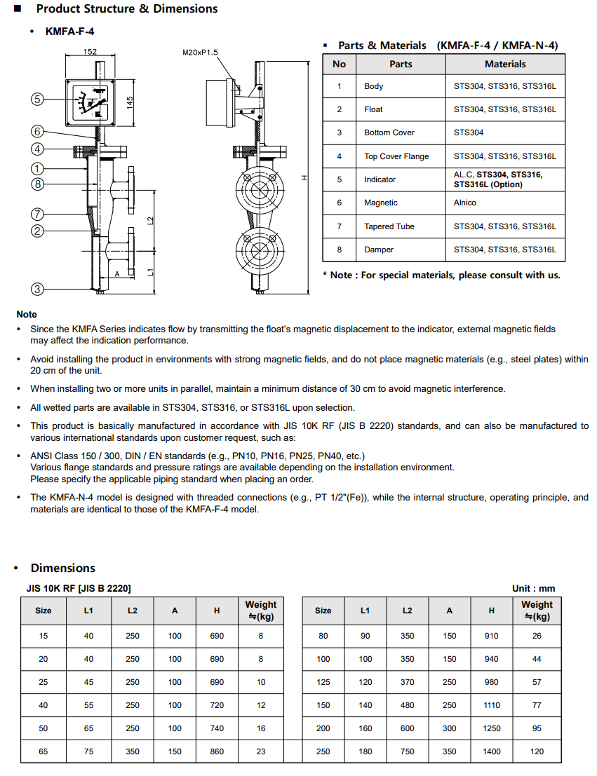 KMFA-F-4 Series is a metal tube variable area flowmeter designed with both the inlet and outlet located on the same side. This structure allows installation without changing the piping direction, providing a significant advantage in space-limited piping environments and parallel pipeline systems. It enables precise flow measurement of various fluids including liquids, gases, and steam. With high accuracy of ±1.5% F.S. and a wide turndown ratio of 10:1, it offers reliable performance. In addition, optional 4–20 mA output and reed switch alarm contacts allow seamless integration with automatic control systems.