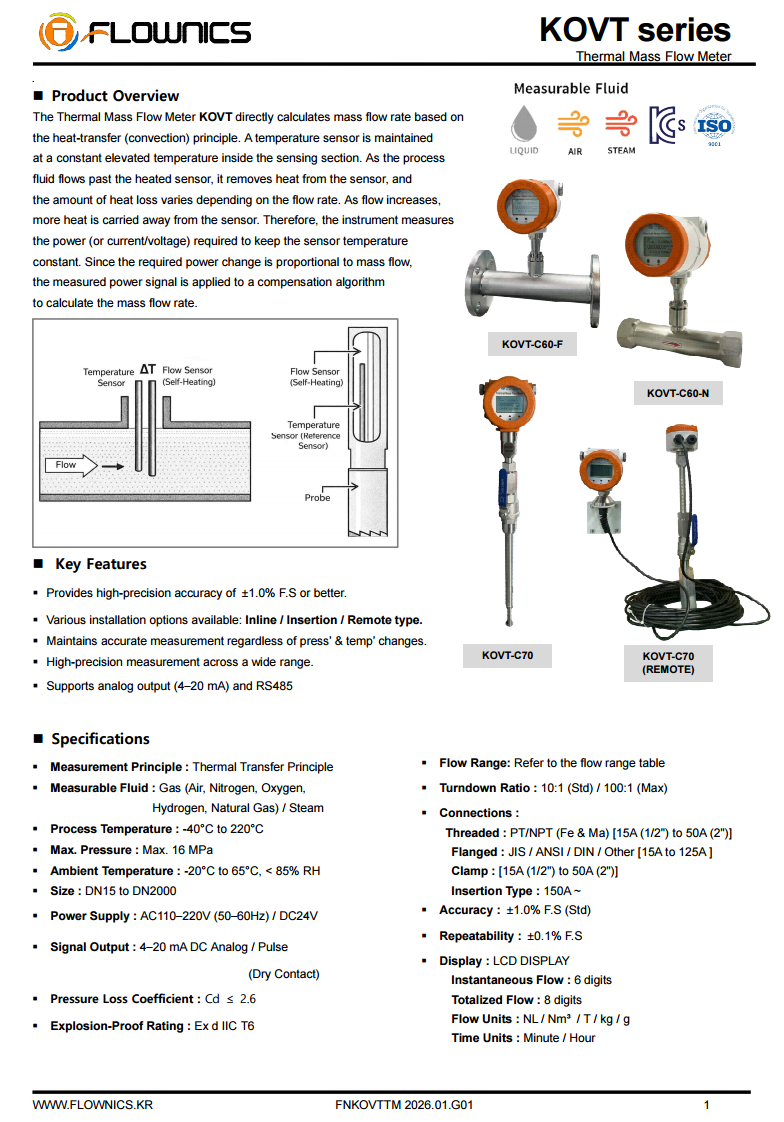 The KOVT Series is a high-performance thermal mass flow meter designed for direct measurement of gas mass flow regardless of pressure and temperature fluctuations. Operating based on the heat transfer principle, it provides accurate and stable flow measurement in various gas applications.