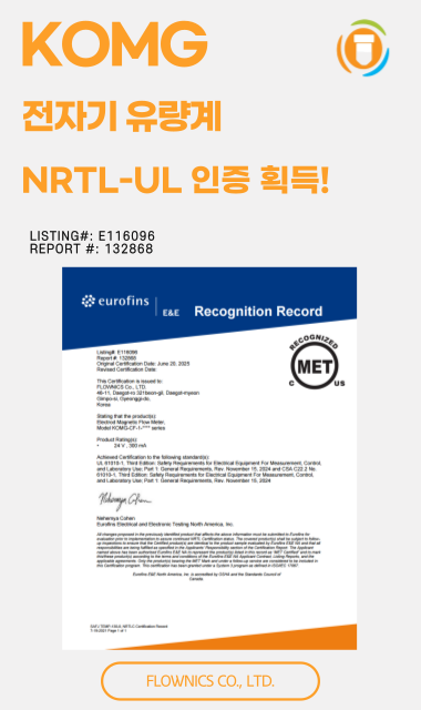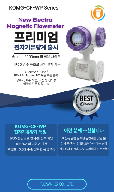 KOMG Series는 당사의 전자 유량계 모델로, 패러데이의 '전자기 유도 법칙'에 기반을 두어 유체를 측정하며, 전도성이 있는 유체가 유량계를 통과할 때 발생되는 전류를 통해 유량을 정확히 계산 합니다.