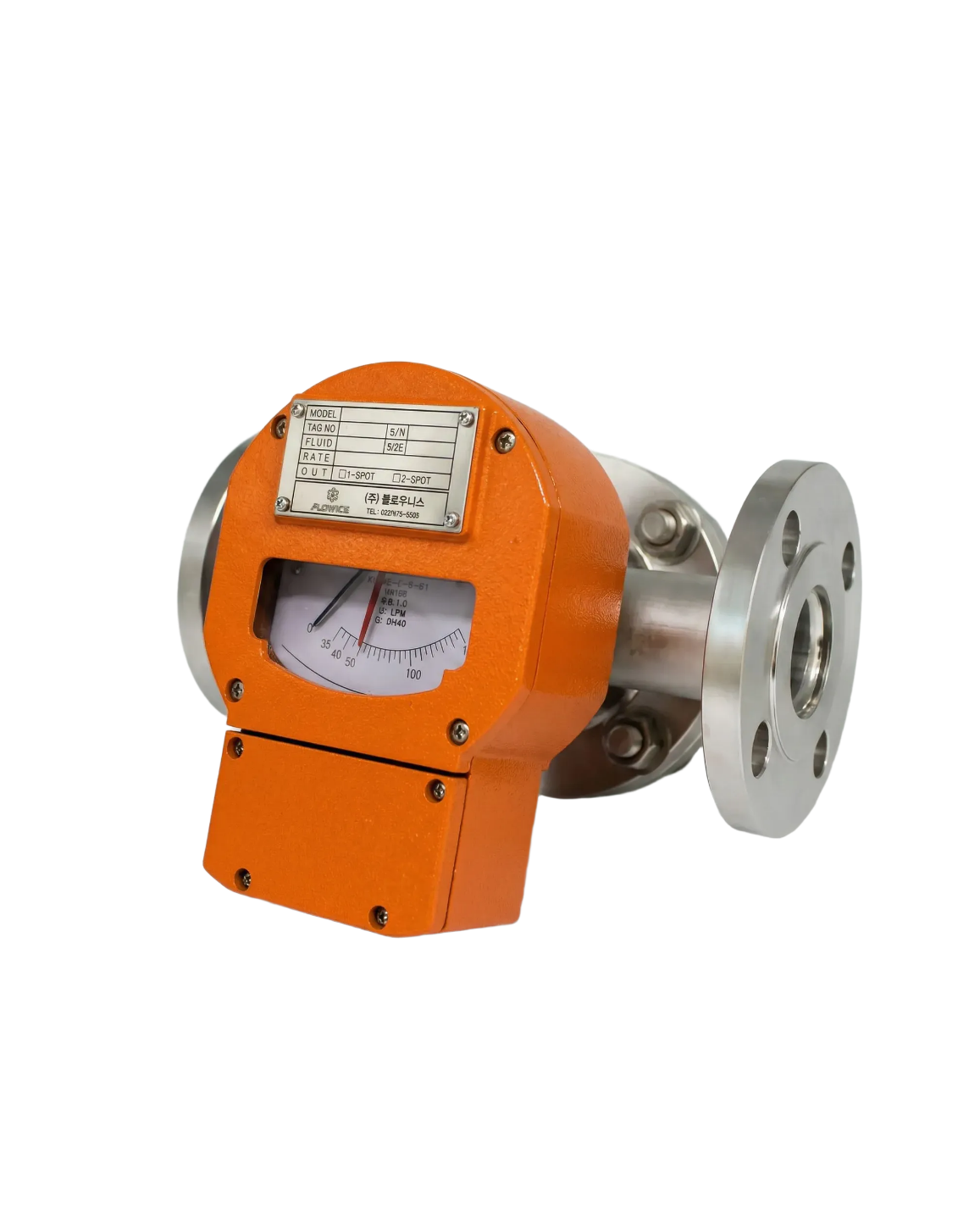유량은 내부 플로트의 위치를 통해 시각적으로 확인할 수 있으며, 4–20mA 아날로그 출력과 리드 스위치 기반의 알람 접점(옵션)을 통해 외부 계장 시스템 및 공정 제어 시스템과 손쉽게 연동할 수 있습니다.