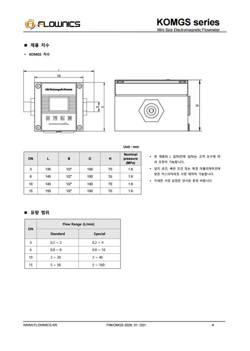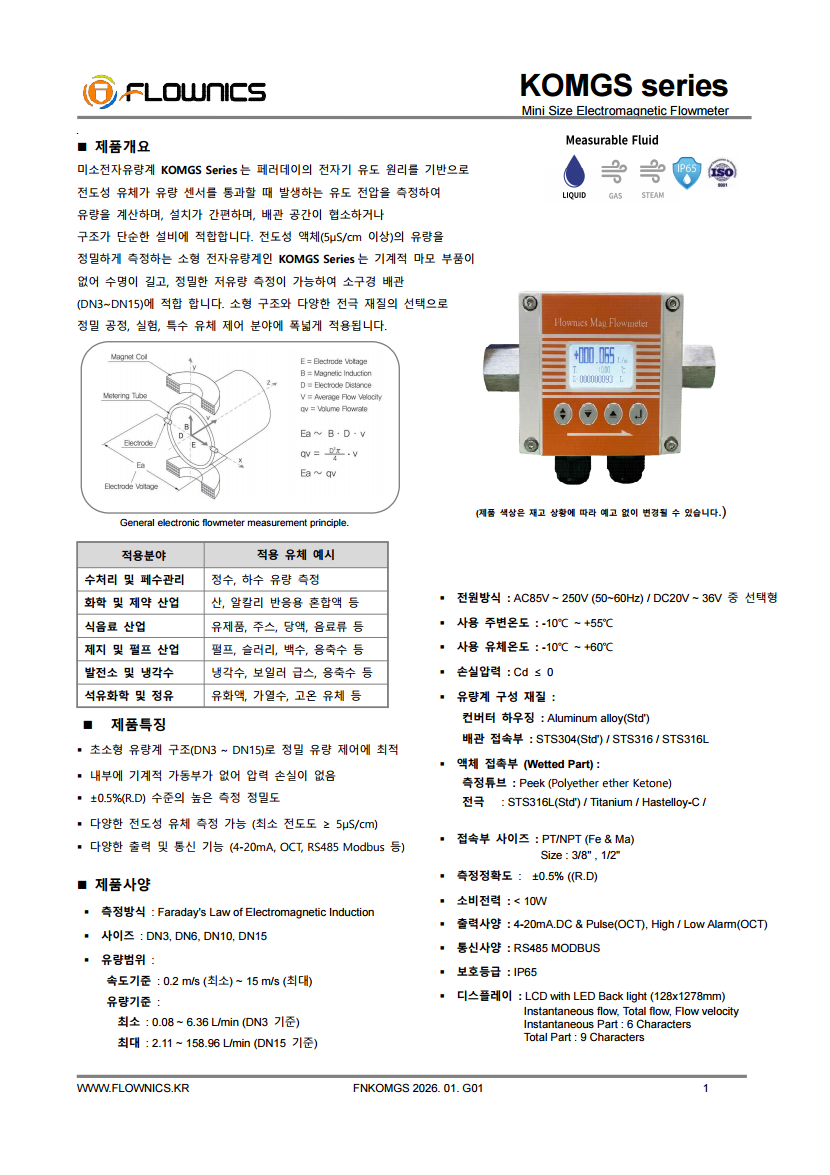 KOMGS 시리즈 미소 전자유량계(Mini Electromagnetic Flow Meter)는
