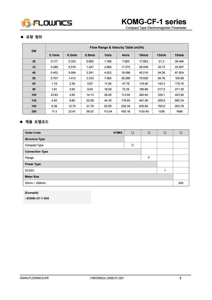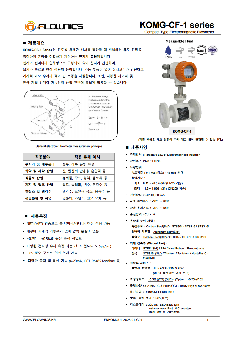 KOMG-CF-1 Series는 전도성 유체의 흐름을 정밀하게 측정하는 전자기 유량계입니다. 센서와 지시부(컨버터)가 일체형으로 설계되어 설치가 간편하고, 빠른 납기와 합리적인 가격으로 일반 산업현장에 최적화된 솔루션을 제공합니다. 내부에 가동 부품이 없어 압력 손실이 거의 없으며, 내구성이 뛰어나 장기간 안정적인 운용이 가능합니다. 상수도, 폐수, 일반 약품, 식음료 등 다양한 분야에서 정확한 유량 측정을 지원합니다.