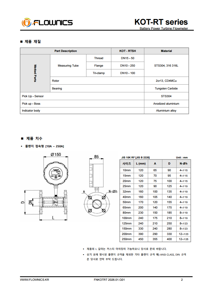 KOT-RTSH 터빈 유량계는 배터리 전원으로 구동되는 고정밀 유량 측정 장비로, 전원 배선이 어려운 현장에서도 액체/기체 유량을 안정적으로 측정하도록 설계되었습니다. 산업용 터빈 유량계의 검증된 구조를 기반으로 내구성과 신뢰성을 강화했으며, 설비 진단·공정 관리·설비 시운전 등 다양한 현장에서 활용할 수 있습니다. 유체 흐름에 따라 터빈 블레이드가 회전하고, 그 회전 속도와 유량이 정비례하는 원리를 이용해 유량을 산출하며, ±0.5%~1.0% 수준의 정밀도와 우수한 반복성을 제공합니다.