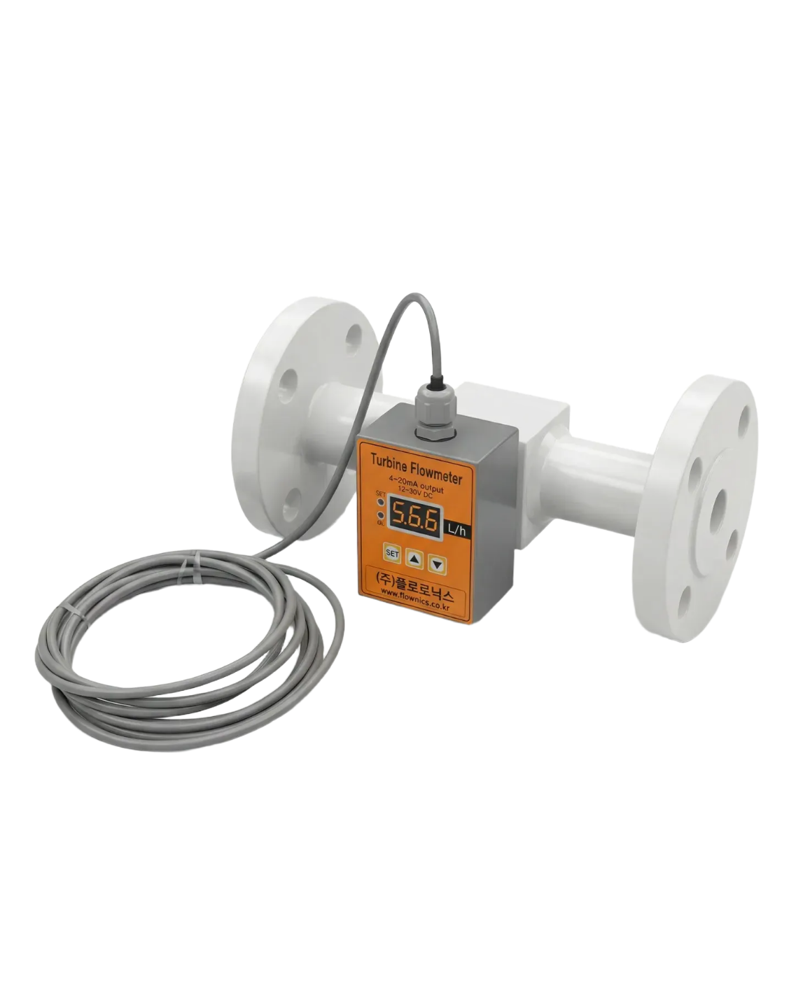 접액부를 PTFE 재질로 구성해 내화학성을 확보했으며, 현장 제어/모니터링을 위한 아날로그(4–20mA) 및 통신(RS-485) 등 다양한 출력 구성이 가능합니다. 유체의 흐름에 따라 터빈 블레이드가 회전하고, 그 회전 속도가 유량과 정비례하는 원리를 이용해 유량을 측정합니다. 공정 운전 중 순시 유량 표시 및 적산 유량(옵션)으로 운전 관리가 용이합니다.