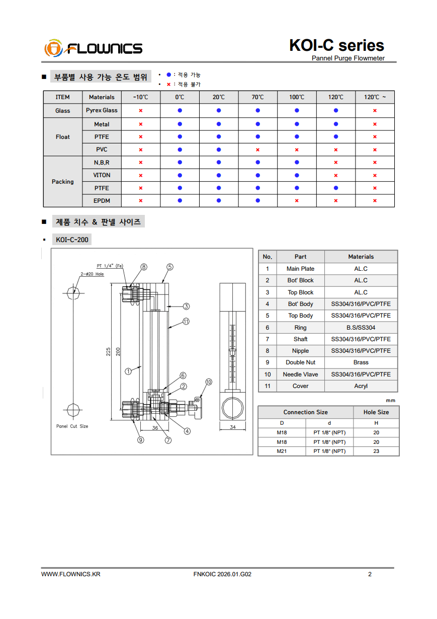 KOI-C Series는 판넬 설치형 퍼지용 면적식유량계로, 미소유량을 정밀하게 제어·모니터링해야 하는 라인에 최적화된 제품입니다. 테이퍼 튜브 내부에서 플로트가 유량에 따라 상승/하강하며, 전면 스케일을 통해 순시 유량을 직관적으로 확인할 수 있습니다. 액체/기체 모두 적용 가능하고, 부식성 유체 환경에서는 TEFLON(PTFE) 또는 PVC 등 재질 옵션을 선택해 운용할 수 있습니다. 또한 니들밸브로 공정 조건에 맞춰 유량을 미세하게 조정할 수 있어 퍼지 라인, 샘플링 라인, 소량 공급 라인 등 다양한 분야에서 안정적으로 사용됩니다.