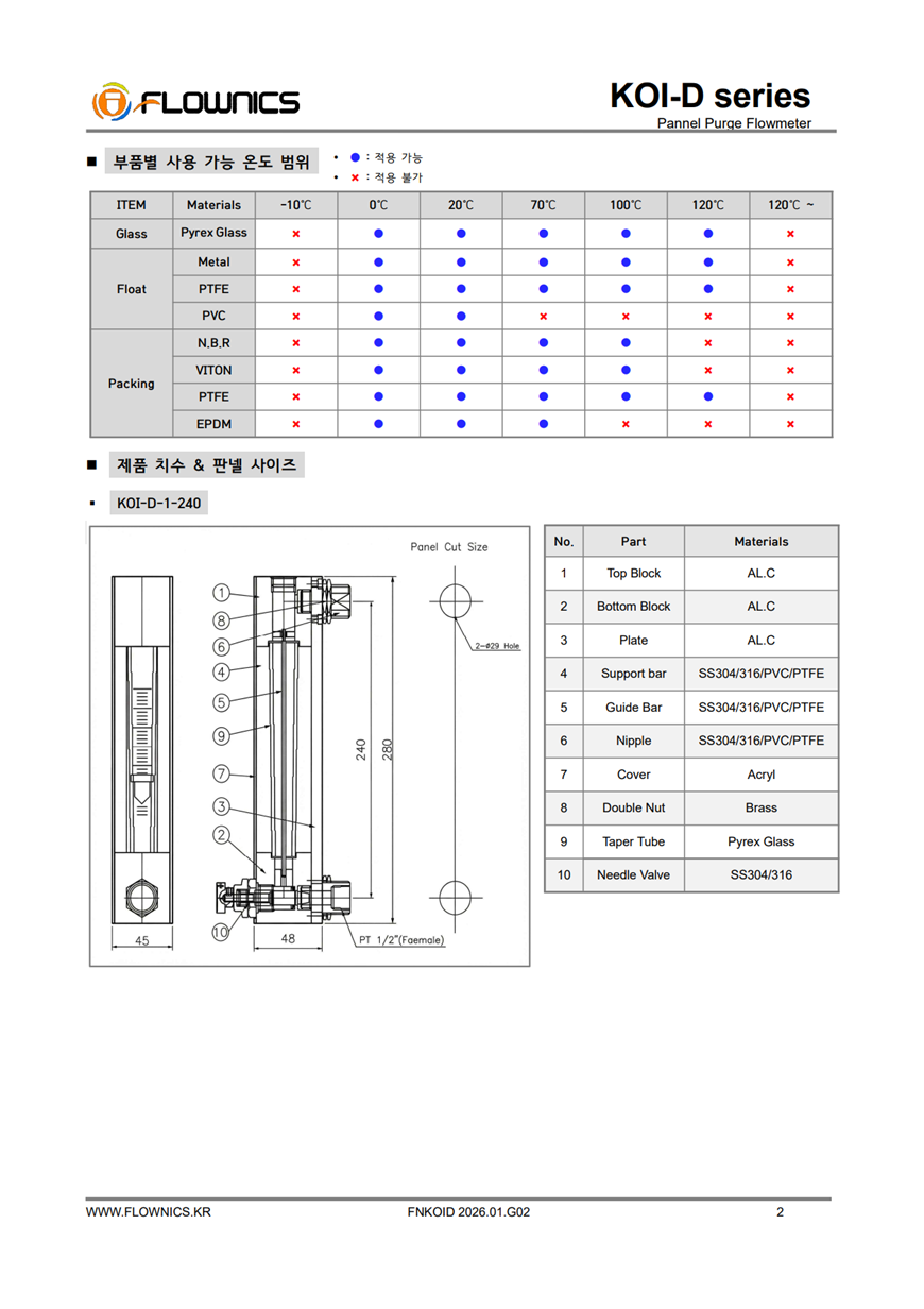 KOI-D Series는 판넬 설치형 퍼지용 면적식 유량계로, 현장에서 미세 유량을 안정적으로 표시·조정해야 하는 라인에 적합합니다. 테이퍼 튜브 내부의 플로트 가 유량에 따라 상승·하강하며, 스케일을 통해 순시 유량을 직관적으로 확인할 수 있습니다. 액체/기체 모두 사용 가능하며, 부식성 유체 조건에서는 TEFLON(PTFE) 또는 PVC 재질 옵션을 적용할 수 있습니다. 또한 니들밸브가 기본 부착되어 공정 조건에 맞춘 유량 미세 조정이 가능하고, 유량 안정화를 위한 GUIDE BAR 구조가 적용되어 안정적인 운용에 도움이 됩니다. 필요 시 Reed Switch 옵션(R1/R2)을 선택하여 신호 출력 구성도 가능합니다.