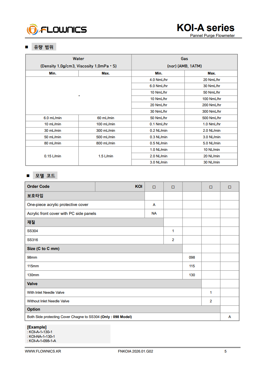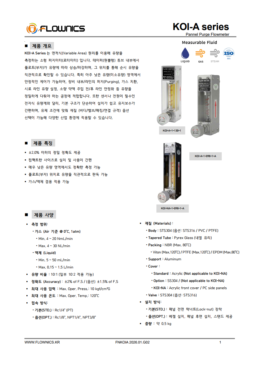 KOI-NA Series는 산업용 액체·가스 유량을 안정적으로 측정하고, 테이퍼 튜브 내부의 플로트 위치로 유량을 시각적으로 확인하는 면적식(Variable Area) 퍼지미터입니다. 기존 KOI-A 대비 보호 구조를 강화하여 제품 양측을 STS304 또는 알루미늄 구조로 구성했고, 전면에는 투명 아크릴 커버를 적용해 가시성과 유지보수 편의성을 함께 높였습니다. 또한 현장 조건에 따라 접액 재질(Body) STS304 또는 STS316 선택이 가능하며, C to C 길이도 98mm(저유량용) / 130mm(표준) 옵션으로 제공되어 적용 폭이 넓습니다.